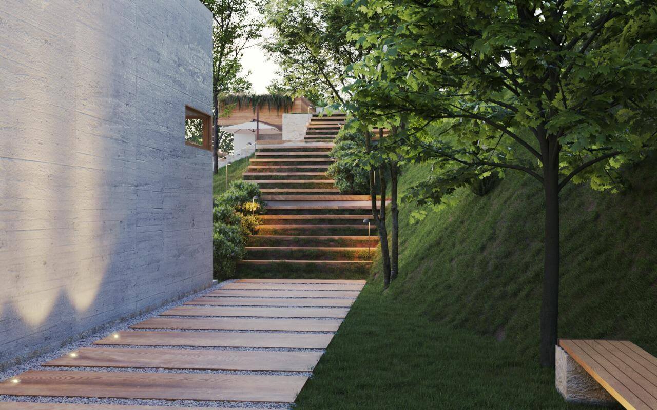 Alinhado ao novo platô na topografia do terreno, o pavimento inferior abriga a área íntima e social da casa, que se enraíza ao jardim externo através de grandes portas envidraçadas transformando a parte social num extenso terraço contemplativo. O telhado do pavimento inferior é usado como base para o mirante do pavimento térreo, com cobertura verde auxiliando nas condicionantes térmicas.