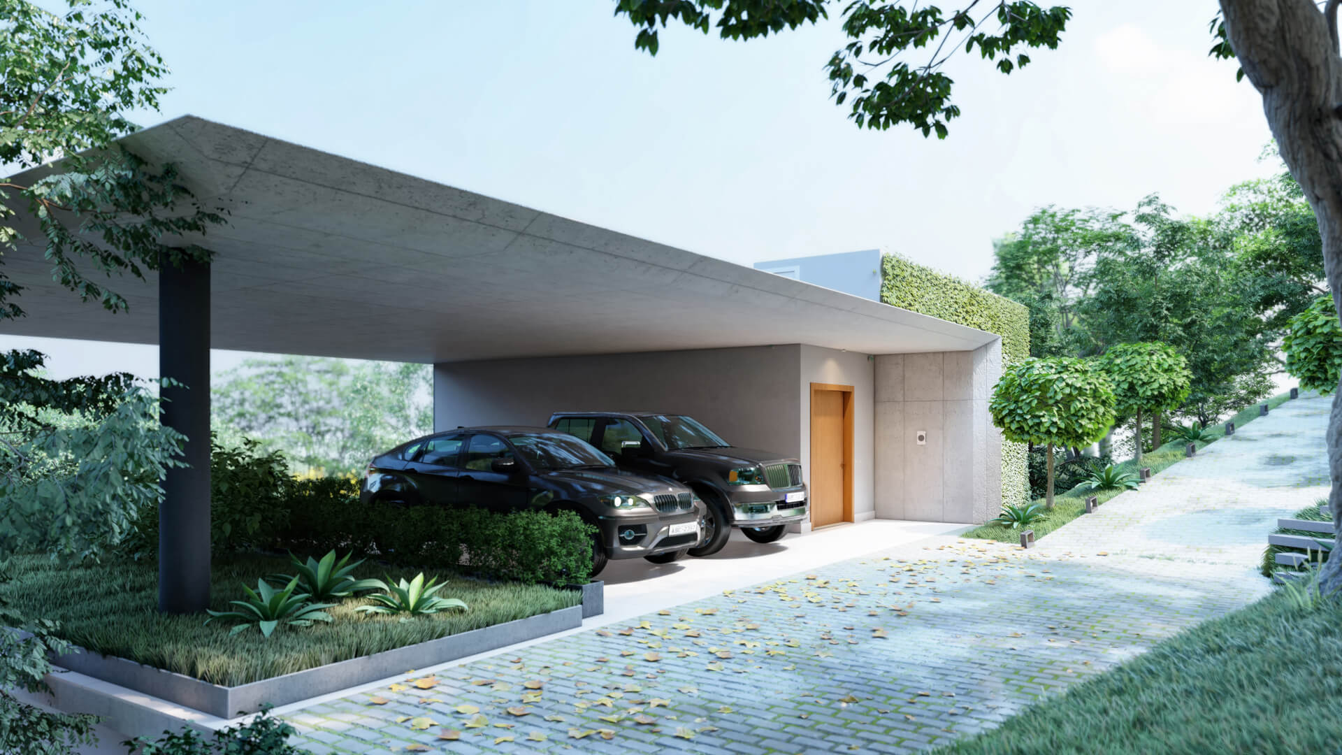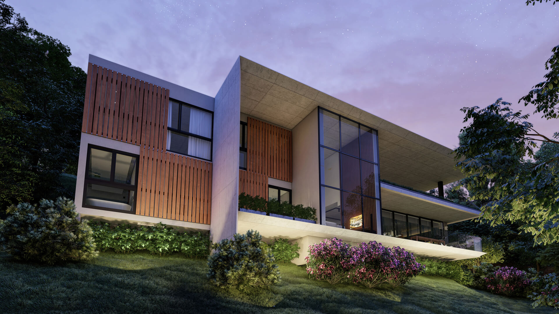 A QUINTA 55 teve seu projeto arquitetônico criado pelos arquitetos Junior Torezani e Victor Sarcinelli do Studio TSAE. Conceituada pela força e robustez dos materiais empregados em contraponto com a beleza do plano de fundo da floresta do Condomínio Espelho d’Água, a casa é marcada pelas esbeltes de suas lajes e marquises em concreto aparente, unindo-se as elevações envidraçadas, que promovem maior iluminação e ventilação natural. A pureza e simplicidade das formas retilíneas cria leveza com os beirais angulados suavizando a inserção da casa na paisagem, que é implantada no nível mais alto do terreno, trazendo maior imponência e destaque com suas largas proporções e espaços generosos, característica singular do projeto. Os limites entre interno e externo são quebrados com a liberdade visual dos cheios e vazios promovidos pelas extensas esquadrias e seus brises verticais, assim como os volumes arquitetônicos que enaltecem as luzes e sombras do interior minimalista e único.